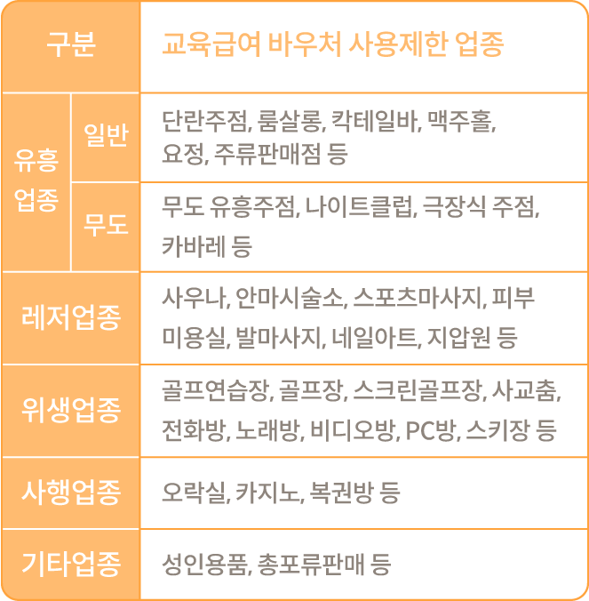 교육급여 바우처는 유흥, 사행업종, 청소년 출입 불가 장소, 상품권, 용품 판매점, 위생업종 등을 제외한 대부분의 업종에서 사용이 가능합니다. 해당 연도 8월 31일까지 사용하지 않을 시 잔액이 전액 소멸되오니 참고하시어 그 전에 필요한 부분에 사용하시길 바랍니다. 카드사의 세부 업종 분류 방식, 사용 대상 상점의 카드사별 가맹 계약 여부, 가맹 계약시 등록된 업종 상태 등으로 카드사별 바우처 사용처에 일부 차이가 발생 할 수 있습니다.